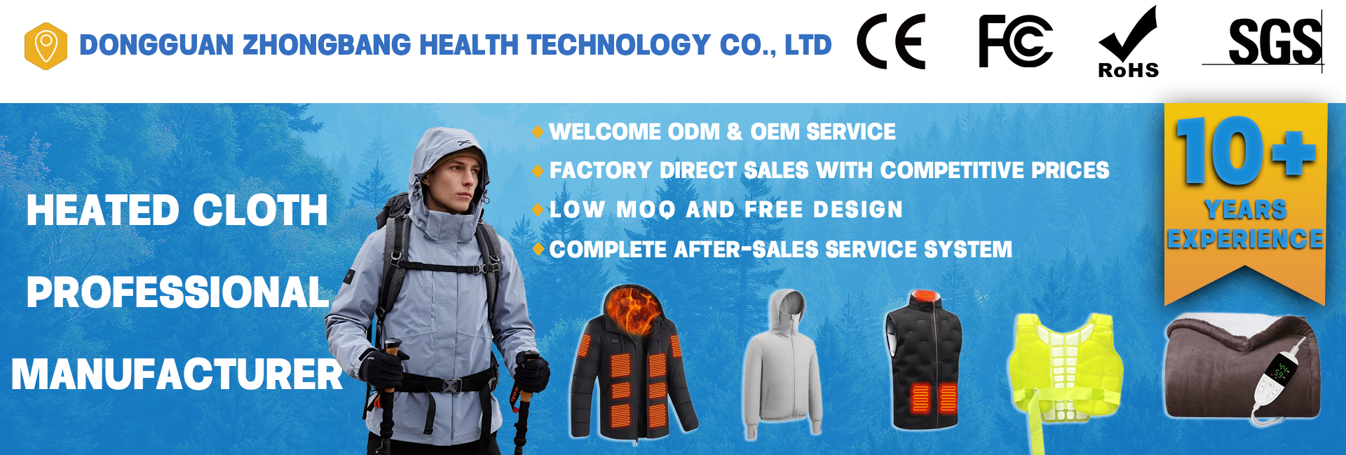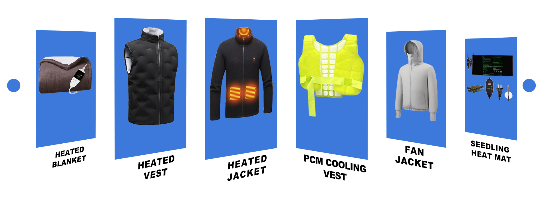 Productos principales:Chaqueta de calefacción, manta calefactora, calcetines calefactables, chaqueta de ventilador de refrigeración, pantalones de ventilador de refrigeración